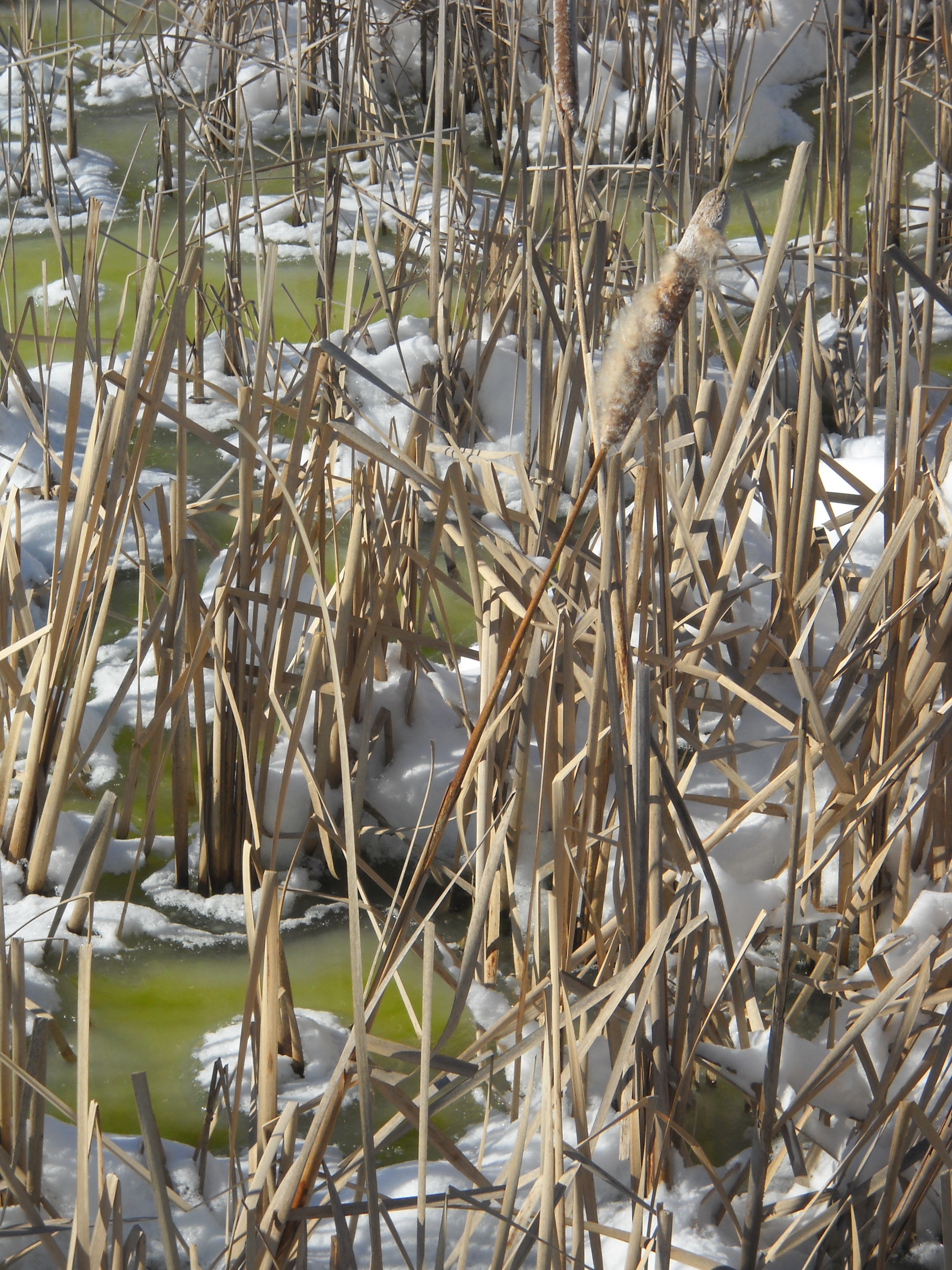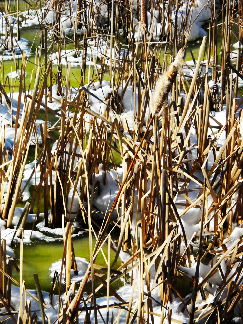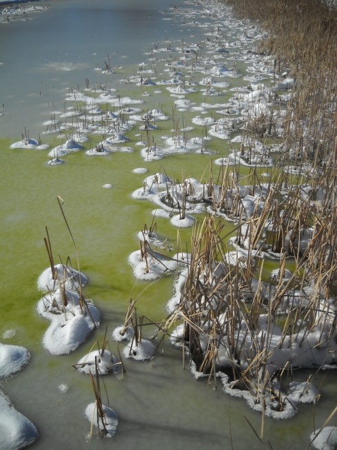 15 FebI LOVE taking pictures in the snow. It makes everything look really different and interesting. I took a “photo expedition” walk outside in the snow and I came across the frozen-over pond. The colors in the frozen water looked super-weird and the little piles of snow around all the dried up plants really interested me. It’s funny how changes in weather can make everything look so unfamiliar…